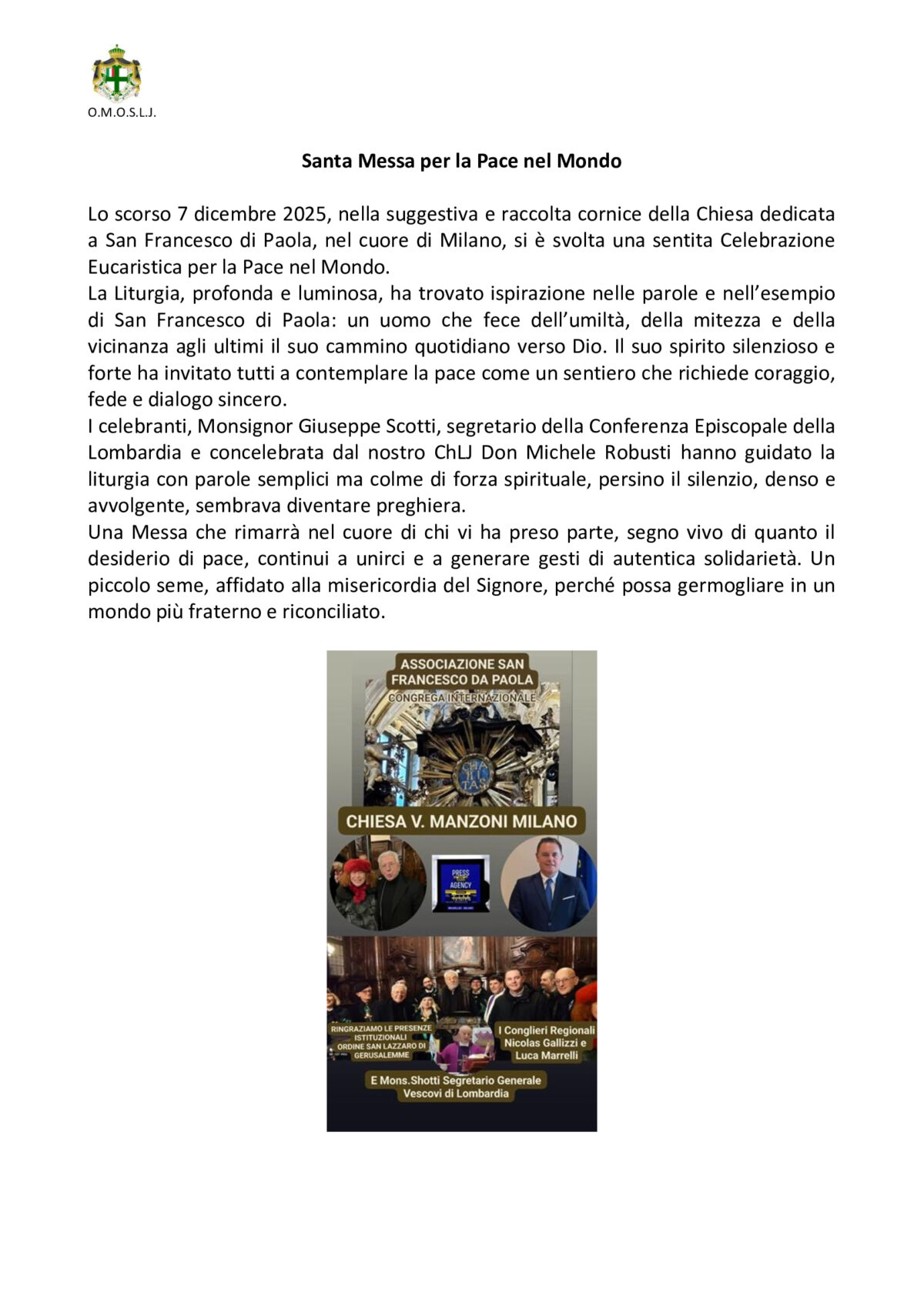 • Milano 7 dicembre 2025 – Santa Messa per la Pace nel Mondo