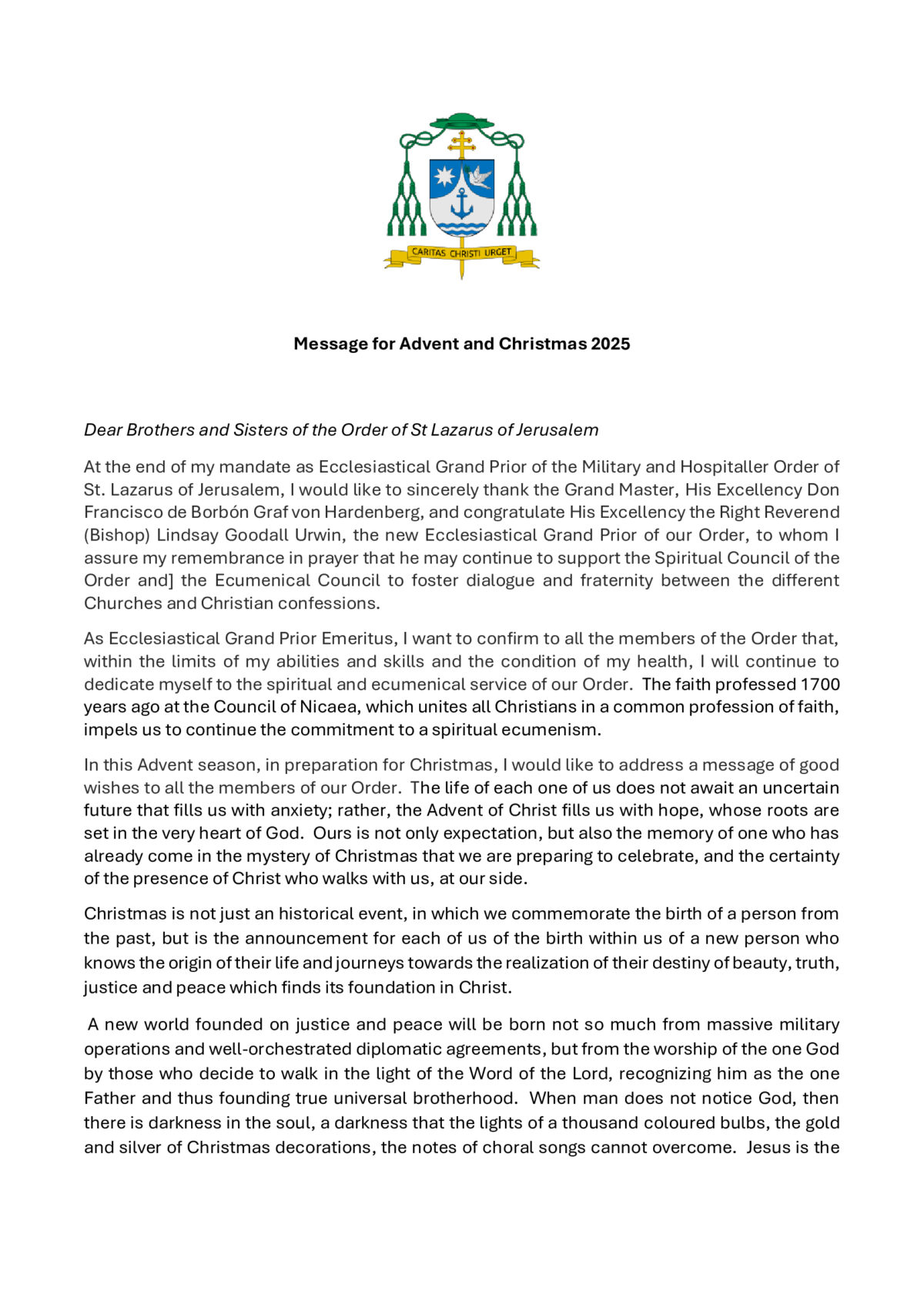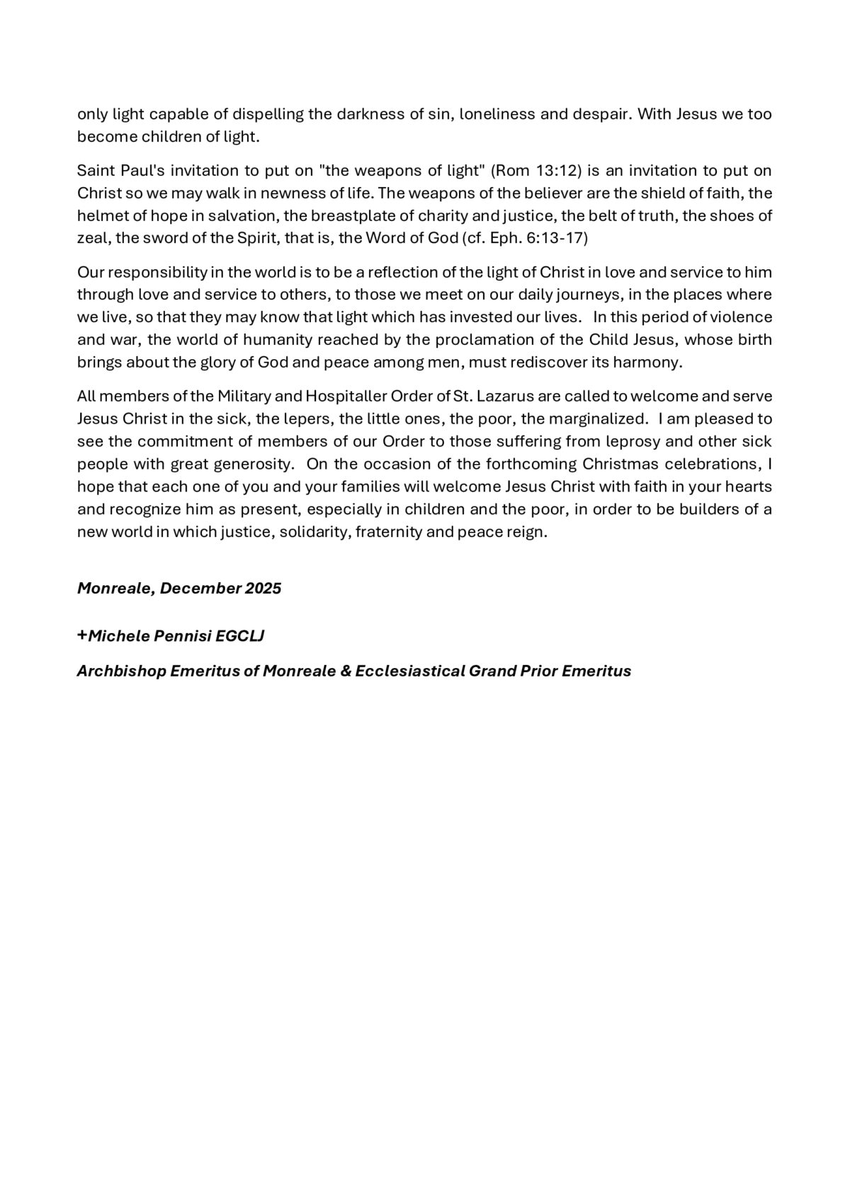 Novembre 2025 – A prayer for our Grand Commander for a speedy recovery Posted on 20 Novembre 2025 by Segreteria Omoslj The Military and Hospitaller Order of Saint Lazarus of Jerusalem – Gran Priory Italy ATAVIS et ARMIS